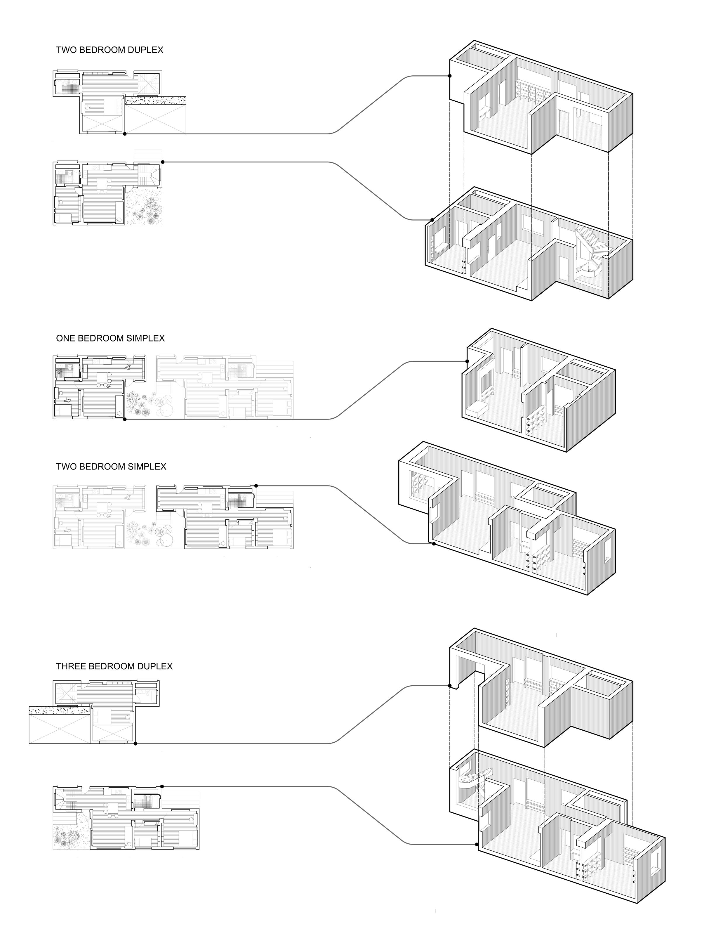 Four distinct unit configurations (two simplexes and two duplexes) cater to a range of household needs and provide flexible living arrangements for diverse family types. Where units converge, shared garden spaces emerge, forming zones where residents can socialize and connect.