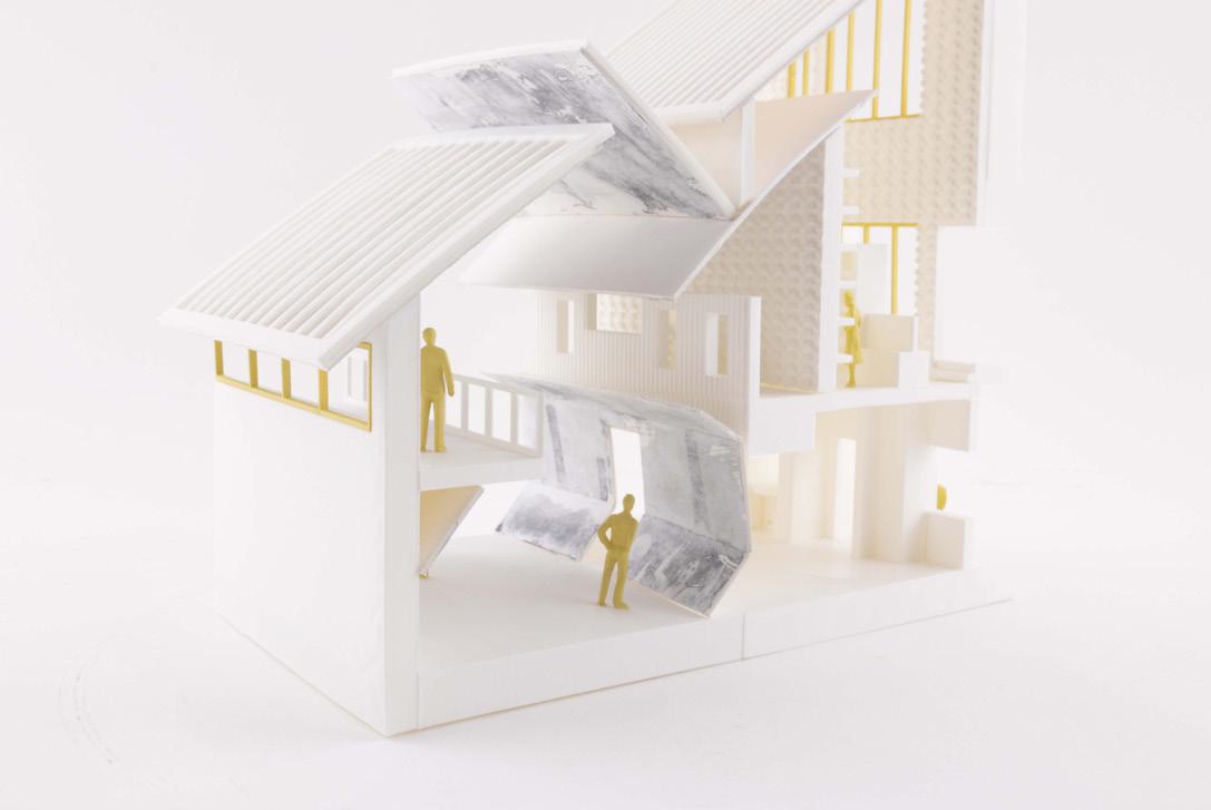 Around this root, programmatic geometries are nested , creating a catalog of interconnected modules that cantilever off the core, allowing for a playful arrangement of spaces . The public areas are placed around the root, while private spaces are subtly nested behind it, offering secluded areas for content production. This core also functions as a grand staircase and atrium, defining the spatial rhythm of the building as each volume extends vertically around it.