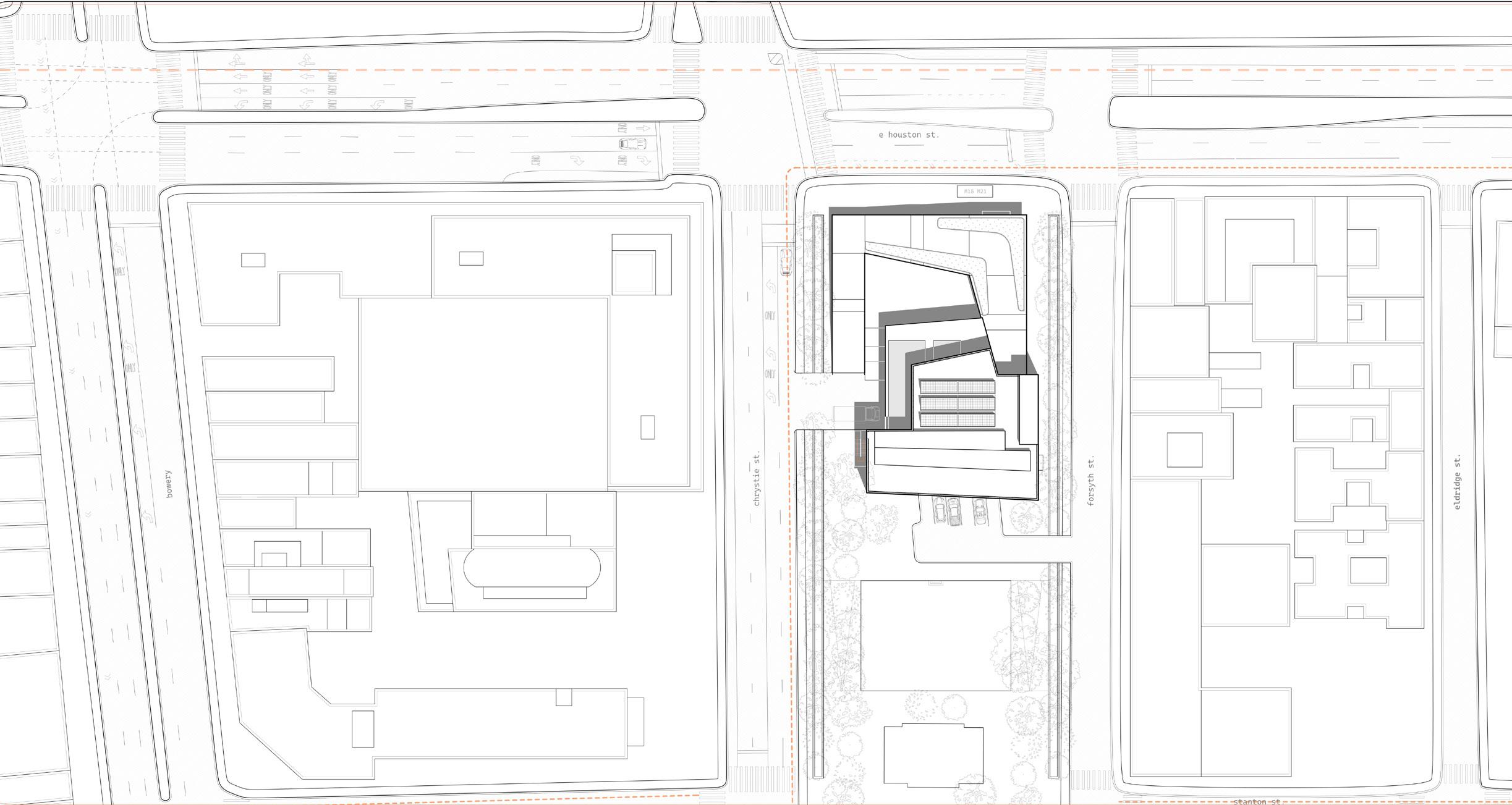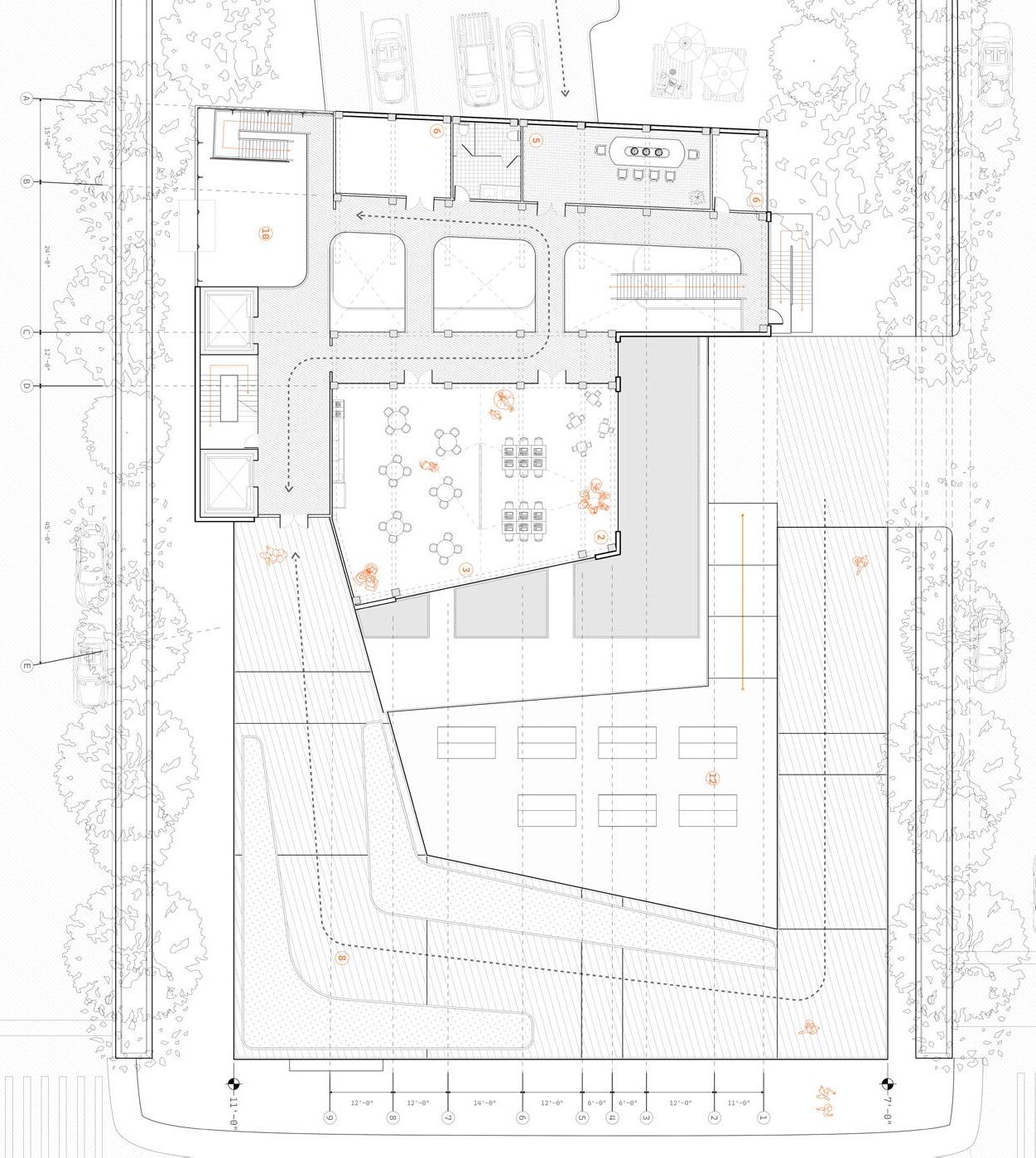 Our design approach took the public space of the park and expanded it vertically. The roof of the market is sloped, creating an elevated green space that feels like a continuation of the existing park. The building entrance is oriented along Houston Street, the busiest thoroughfare, to draw in passersby and provide views into the bustling market space below through a transparent glass facade. This connection between the street and the market creates an inviting, open atmosphere for the community.
