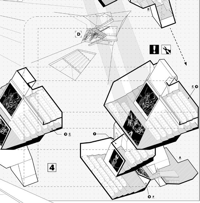 Located at the Marcy Library in Bed-Stuy, Brooklyn, this project transforms a mid-century branch library into a dynamic extension for audiovisual education and film . The design reinterprets the relationship between public and private spaces, pushing and pulling these boundaries to blur the lines between library, park, and city , thus making the space accessible and engaging for both viewers and creators alike. At the heart of the design is the “tap root,” a central core that serves as a vertical spine for circulation and spatial organization . This core rises lightly from the ground, symbolically and structurally like a root tapping into the earth and spreading upwards and outwards.