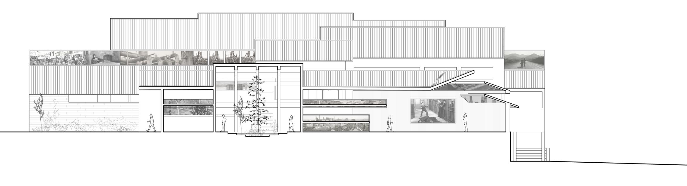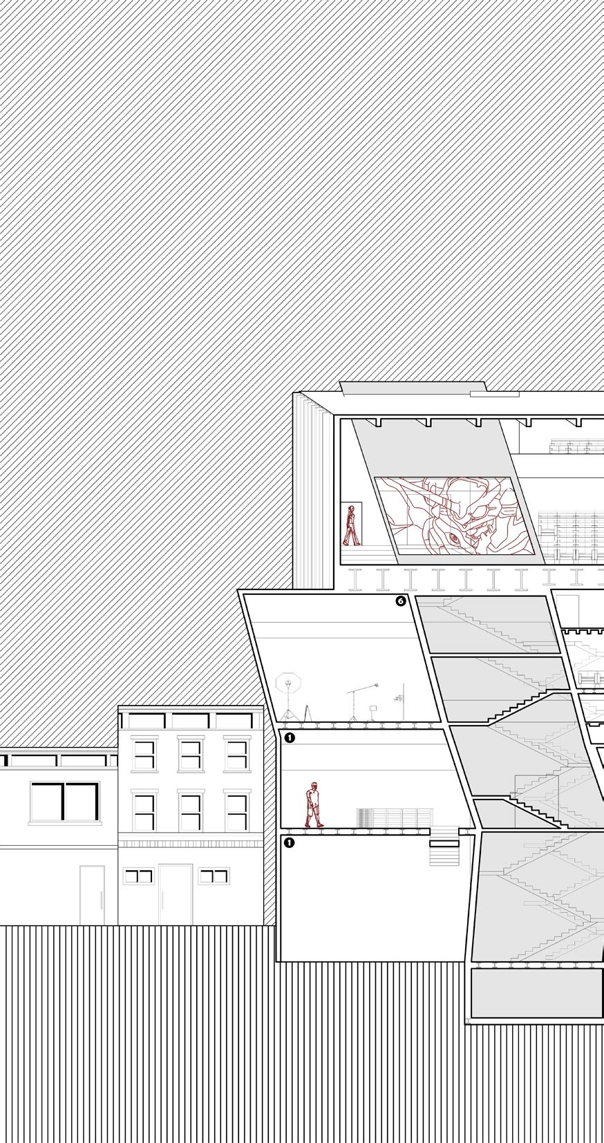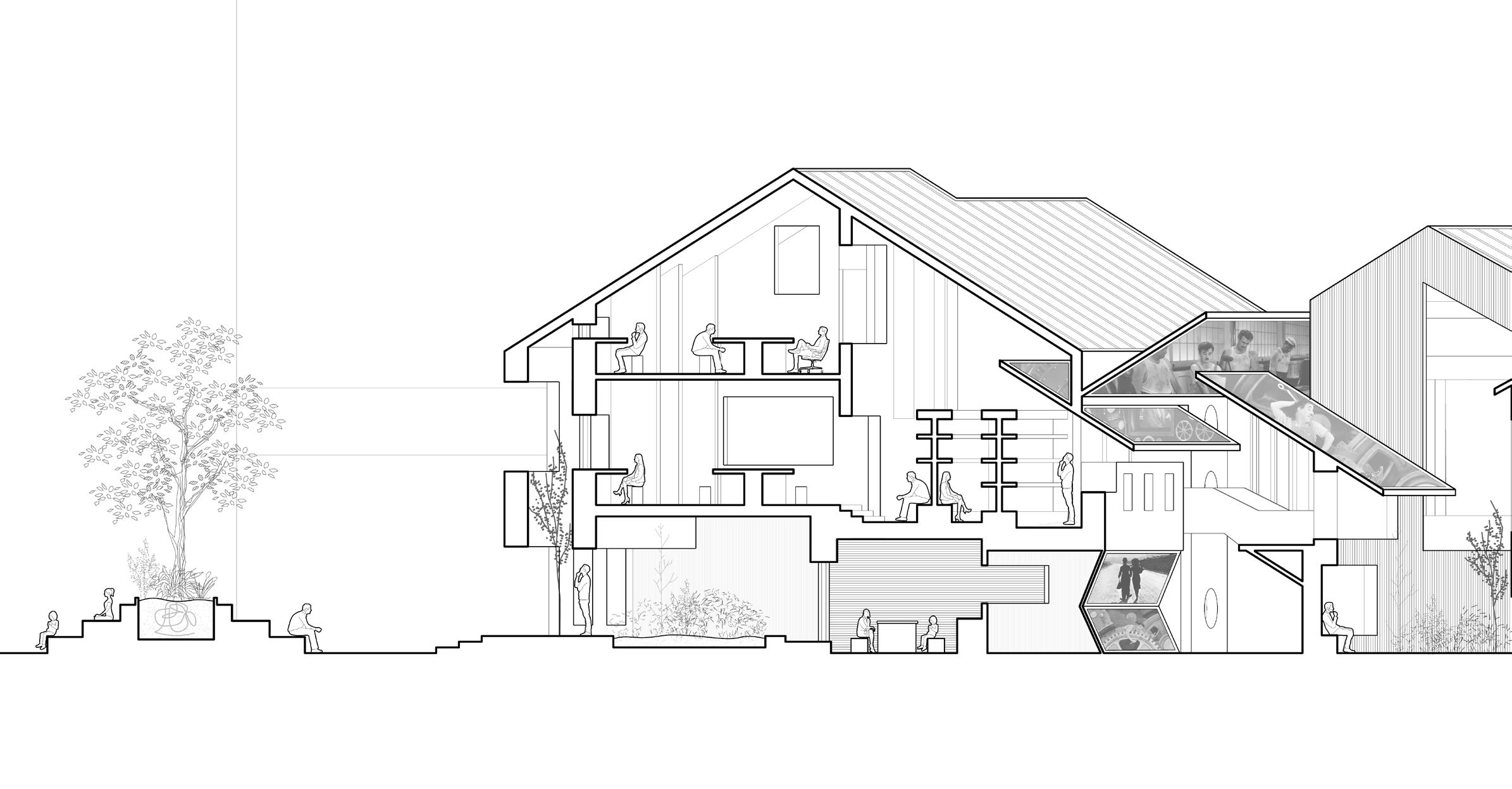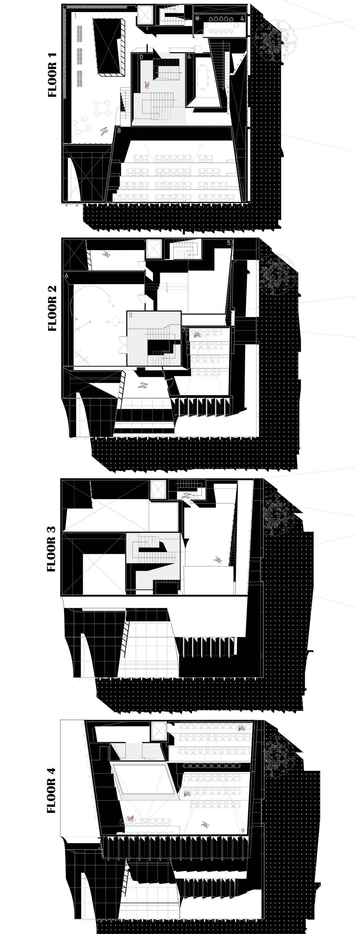 The porous nature of the central root offers glimpses into the three main theaters as users ascend the floors. Each theater pushes against the core, with screens that are visible from both inside and outside , offering an intriguing peek at what’s being shown. This design allows the building itself to act as an interface for cinema , inviting passersby and library visitors to experience film in a new way. By raising the floors, the ground level remains open, allowing the park’s energy to extend into the building and draw in the community from the street level.