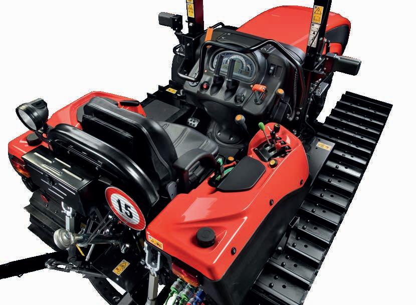 consola, do lado direito. O arco de segurança fixo de 4 pilares garante a máxima segurança e pode ser atualizado com um prático tejadilho para-sol. Estão disponíveis luzes de trabalho opcionais de halogéneo ou LED, juntamente com um alternador maior e um compressor de ar condicionado instalados de fábrica para simplificar a instalação de uma cabina de substituição. Também estão disponíveis várias opções de lastro, desde pesos frontais a proteções do chassis em ferro fundido.