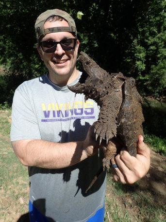 Dr Coleman (the one with the hat) poses with an alligator snapping turtle he met on a field excursion.