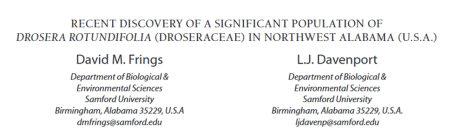 Together, Frings and Davenport recently published a paper documenting their discovery of a large population of carnivorous roundleaf sundew in the Sipsey Wilderness in Winston County, AL More typically found in colder climates, this is the southernmost known population of the species.