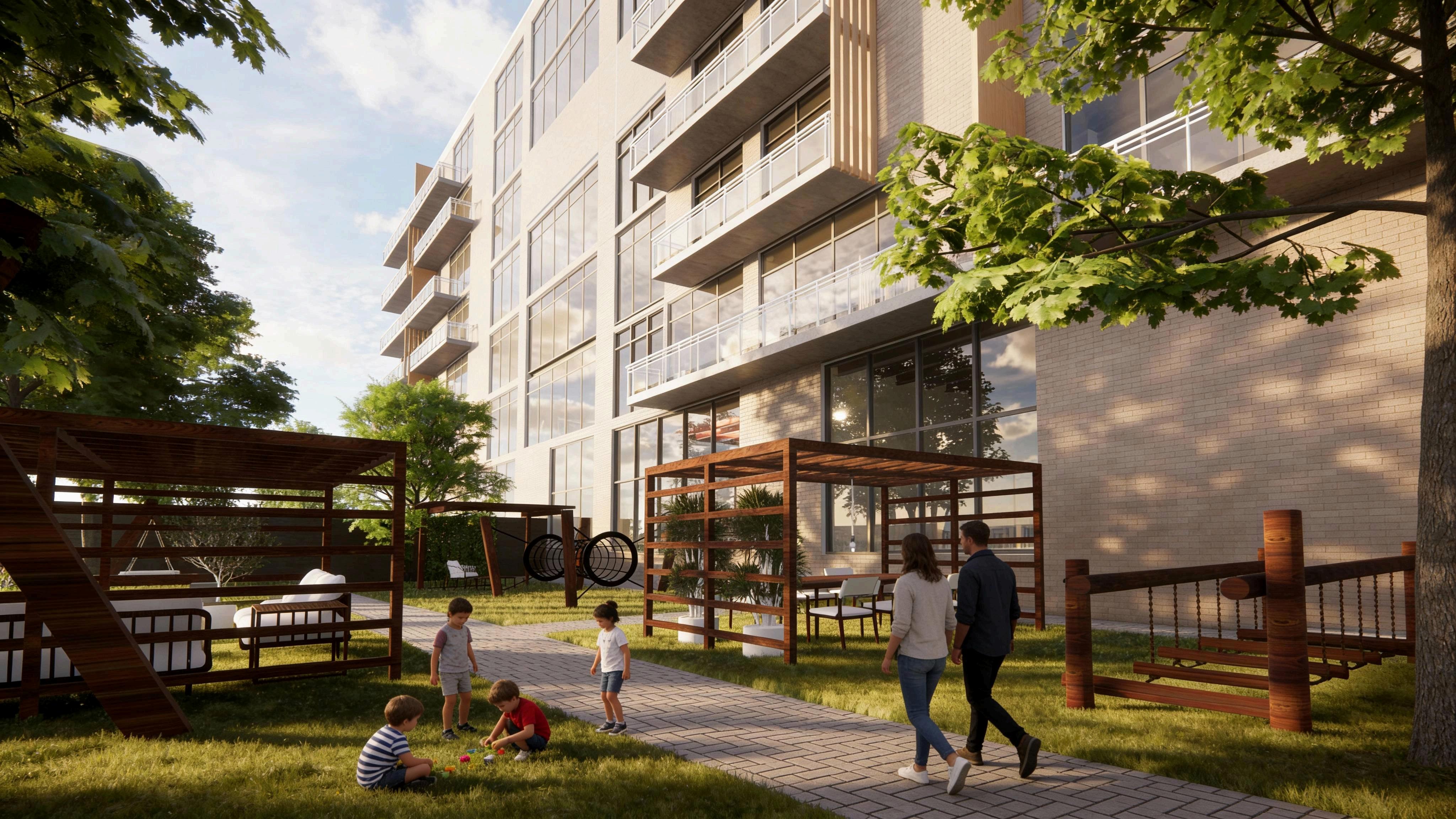 Outdoor green area encourages daily movement, casual social encounters between generations, and supervised play for children.