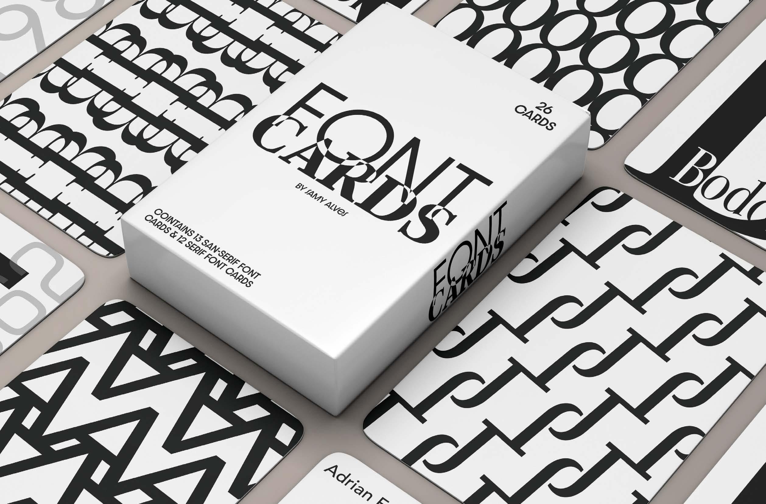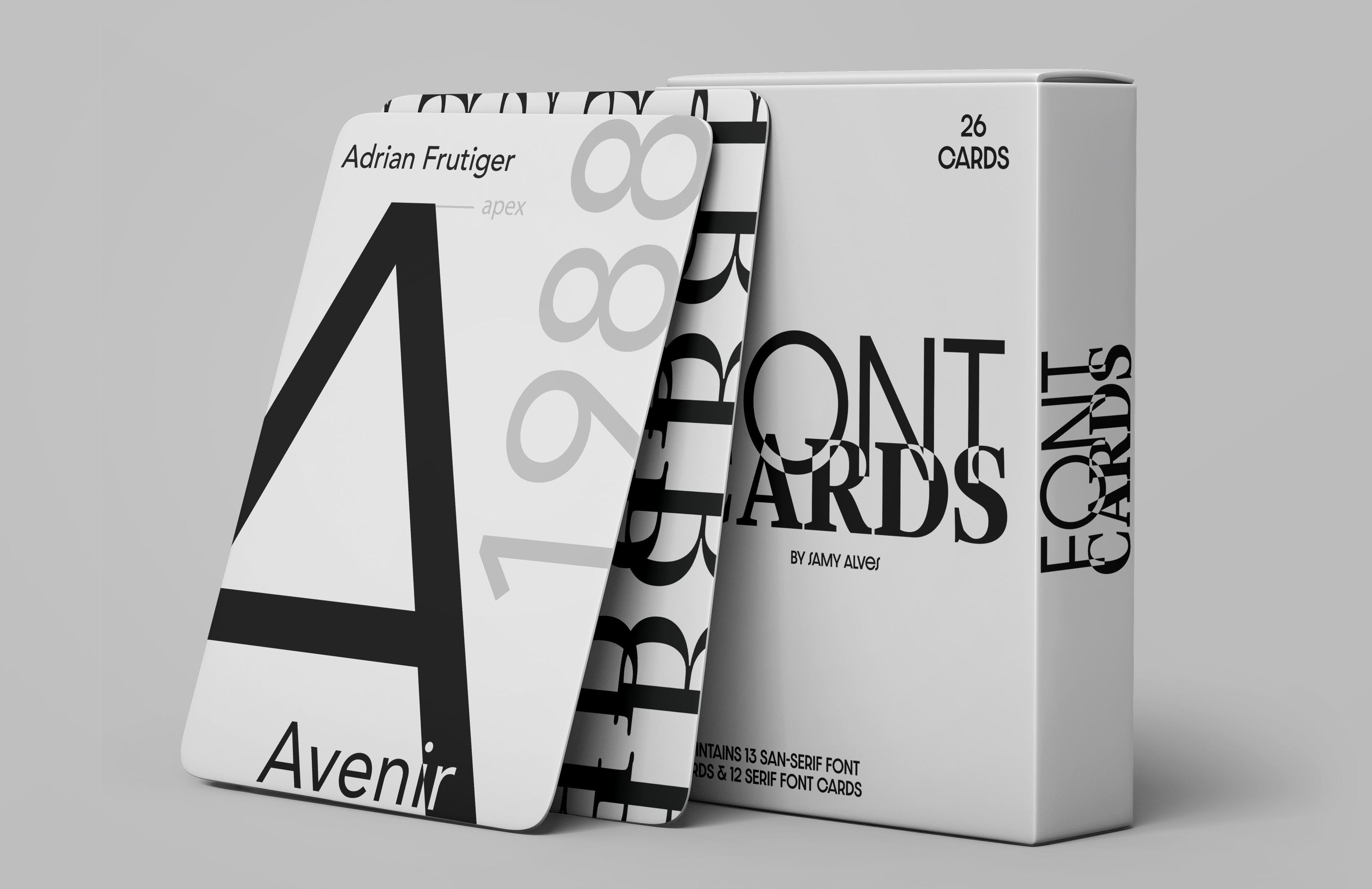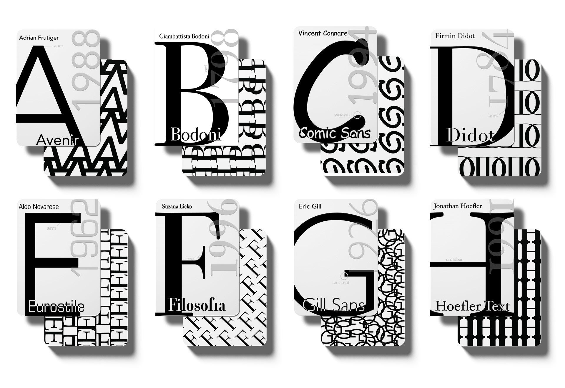 A collection of 26 different typefaces, containing 13 sans-serif fonts cards and 13 serif font cards, this complex project required technical tools, design skill and craftsmanship. For each typeface, the cards display the year, the designer and the font’s name.