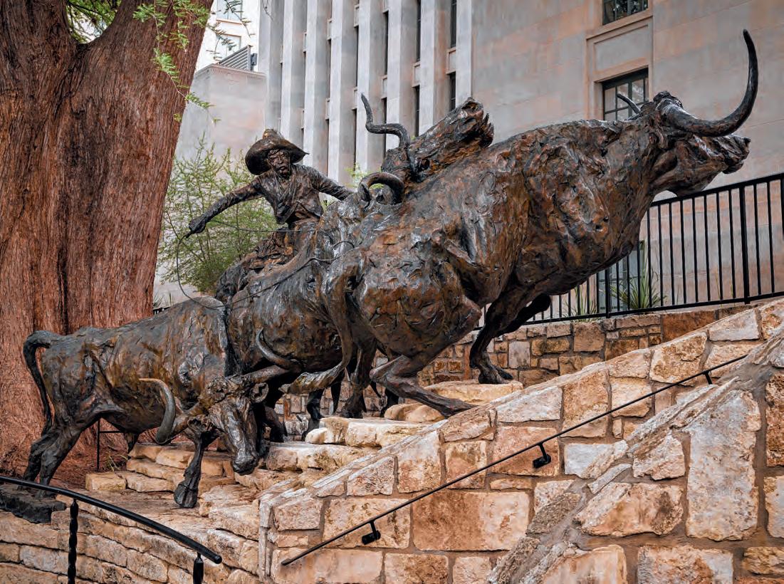CAMINO DE GÁLVEZ,” THE DYNAMIC BRONZE SCULPTURE THAT STANDS AT THE REAR OF THE BRISCOE Western Art Museum, captures a moment in time in San Antonio history. It depicts a vaquero driving steers up a riverbank, a scene that may have played out often in that area in the 19th century. Back then, the area between what is now the museum and the Hotel Contessa was a low point in the river, making it a good crossing spot for cattle drives.