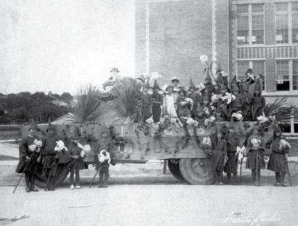 Costumed Alamo Heights school students show off the float created for the Battle of Flowers Parade.