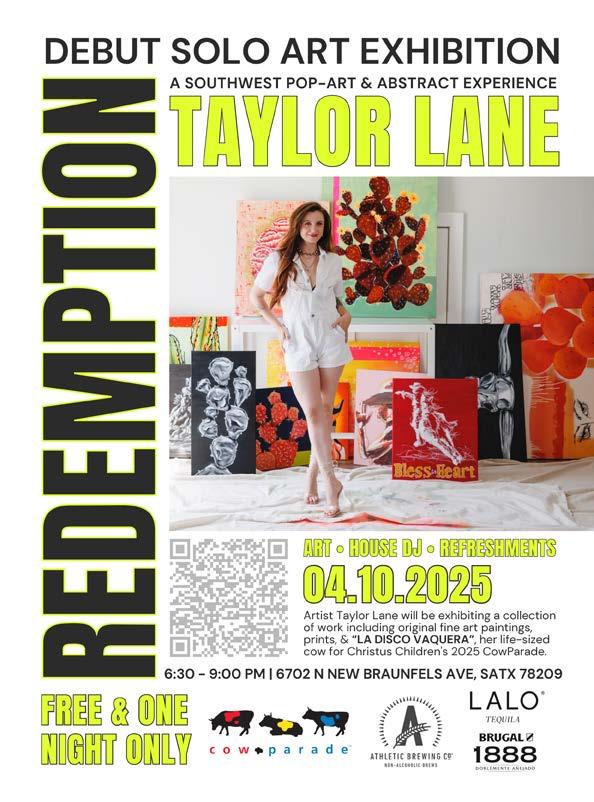 Head to our calendar listings for some fun Fiesta festivities happening in and around Alamo Heights. My dear friend and amazingly talented artist, Gio DiZurita, will be celebrating the opening of her exhibition Epiphany in Paradise with a reception at AnArte Gallery on April 9th! Double up on art shows this month, as I invite you to experience my own debut solo art exhibition on April 10th, where I will be revealing my completed cow, “La Disco Vaquera,” for the 2025 CowParade by Christus Children’s!