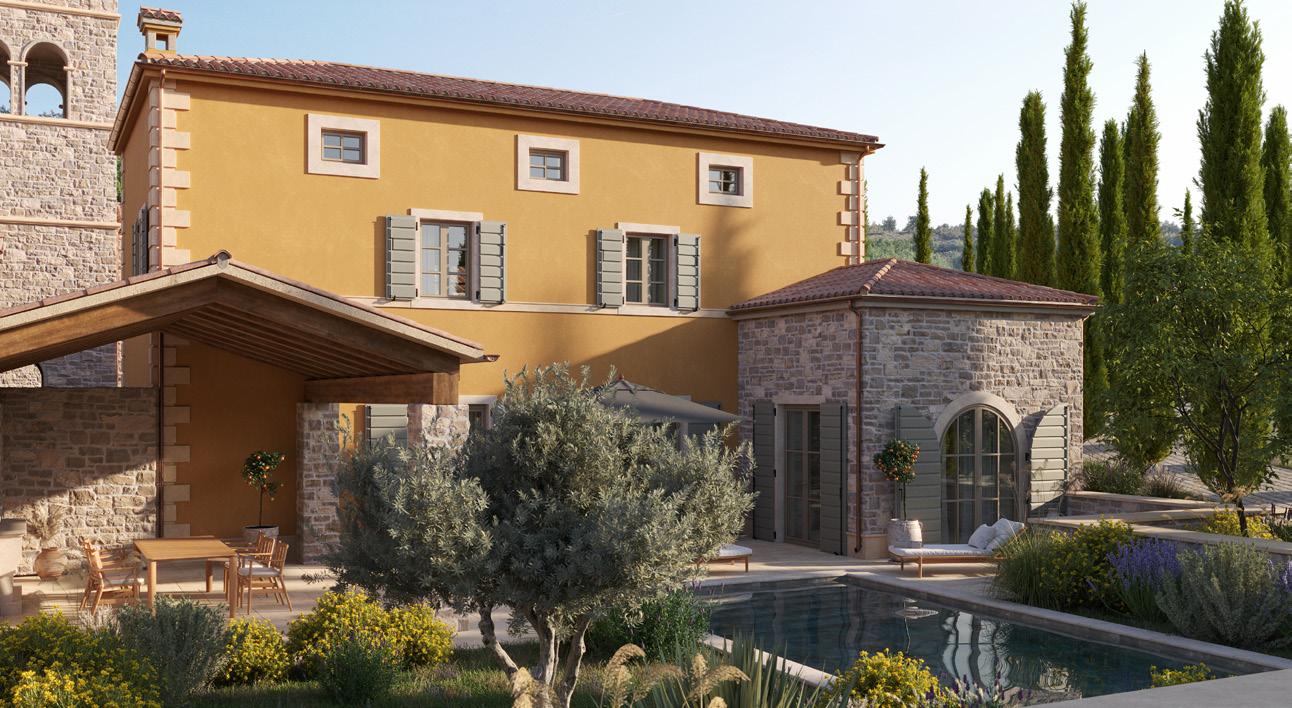 Architectural accents celebrate natural imperfections of wood and stone, creating a profound countryside luxury experience that is distinctly San Canzian.