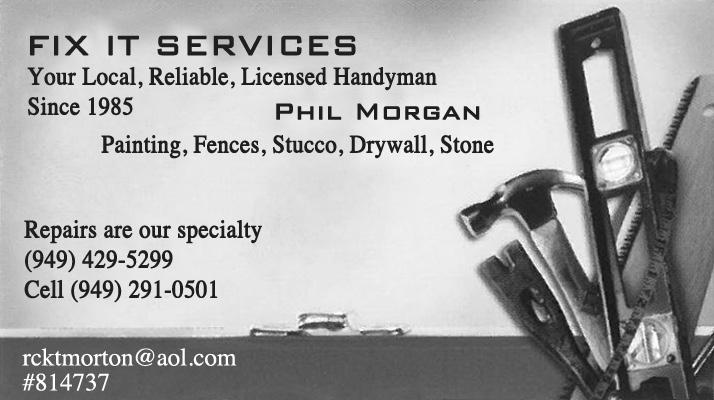Flat screen TV’s installed, anything Electrical, Plumbing, Finish Carpentry, Drywall Repairs, Mold and Wood Rot issues, Waterproofing, Decks and Patio covers repaired, Doors, Windows, Kitchens and Baths, Water Damage Restoration, Custom Sheet Metal Fabrication and Much More. Phone Chris –949 510 6645