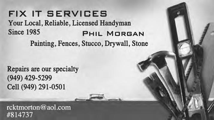 Flat screen TV’s installed, anything Electrical, Plumbing, Finish Carpentry, Drywall Repairs, Mold and Wood Rot issues, Waterproofing, Decks and Patio covers repaired, Doors, Windows, Kitchens and Baths, Water Damage Restoration, Custom Sheet Metal Fabrication and Much More. Phone Chris –949 510 6645