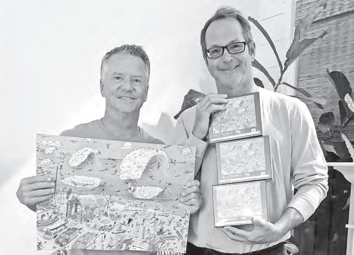 “But the puzzle is—it’s kind of weird, because I can’t explain why there’s a cowboy in a Speedo playing horseshoes with his horse on the sand, and why there’s a chicken there, and there’s a guy in an inner tube there,” Snibbe continued, explaining how the ideas for his art come to him. “It’s just stuff that pops into my head, and I’m off to the races with my pencil.”