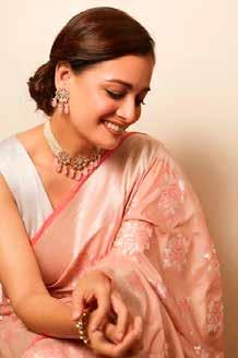 Spotlight on environmentalist Dia Mirza in a peach coloured, handwoven Ekaya Banaras silk sari. Embossed with delicately-sized rose repeats, the blush hued drape is as elegant as it is timeless. A simple styling & a borrowed heirloom necklace – that’s the not-so-secret recipe to embody the grace of a silk masterpiece.
