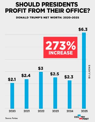 According to the editorial, the figure represents a minimum estimate, as several revenue streams linked to Trump and his family remain opaque or difficult to value. The report argues that Trump’s return to the White House has coincided with an unprecedented expansion of his personal and family-linked commercial ventures, many of which depend on political visibility, regulatory decisions, or foreign relationships.
