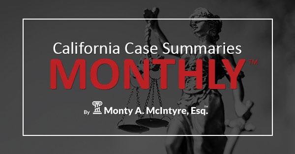 These recent cases summarized by Monty A. McIntyre are from his publication California Case Summaries™. Monty prepares short summaries (one paragraph), organized by legal topic, of every new published California civil and family law case that California lawyers can subscribe to on either a monthly, quarterly or annual basis. Monty also offers specialized practice area annual summaries in the areas of Employment, Family Law, Real Property and Torts. For more information go to https://cacasesummaries.com. A California civil trial lawyer since 1980, a member of ABOTA since 1995, a past president of the SDCBA and San Diego ABOTA, and also an expert Zoom user, Monty serves as a mediator, arbitrator and referee with ADR Services, Inc. handling cases throughout California in the areas of business, elder abuse, employment/wage & hour, insurance bad faith, legal malpractice, medical malpractice, personal injury, real property and wrongful death. Web: https://www. adrservices.com/neutrals/mcintyre-monty/ To schedule a matter, contact Monty’s case manager Haward Cho, (619) 233-1323 or haward@adrservices.com.