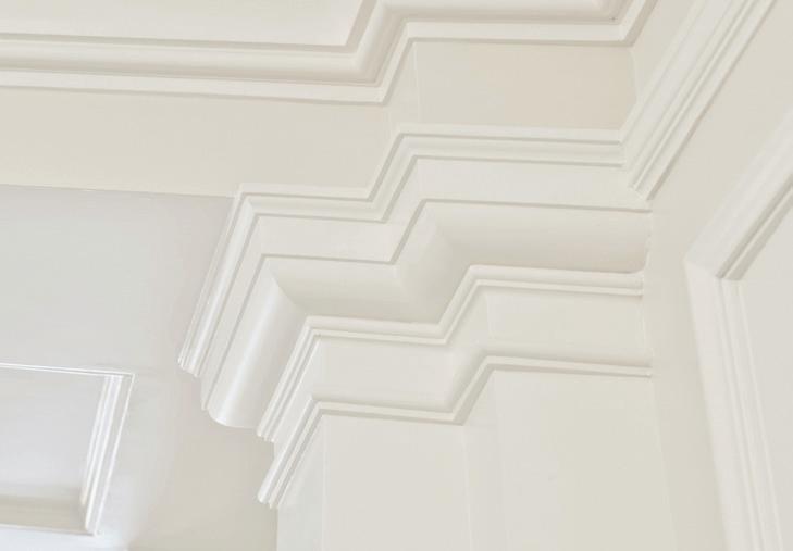 The organic shape of the elliptical coffered dropped ceiling required artisinal quality plasterwork and high gloss finishing by hand. Downlights and the hidden valance for the window treatment create a seamless profile.