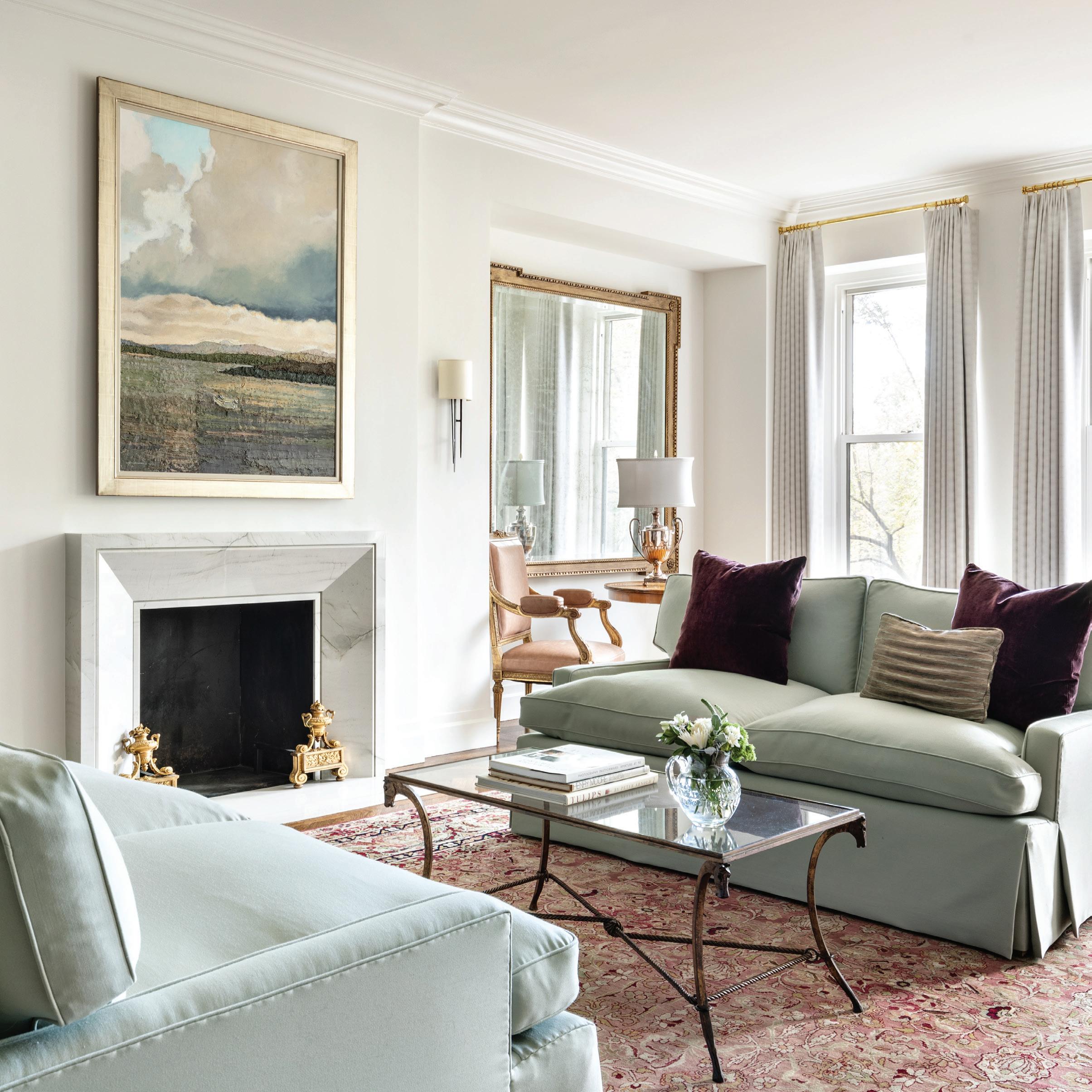 The living room reflects the period elegance of the Rosario Candela design, with a marble-clad fireplace as focal point.