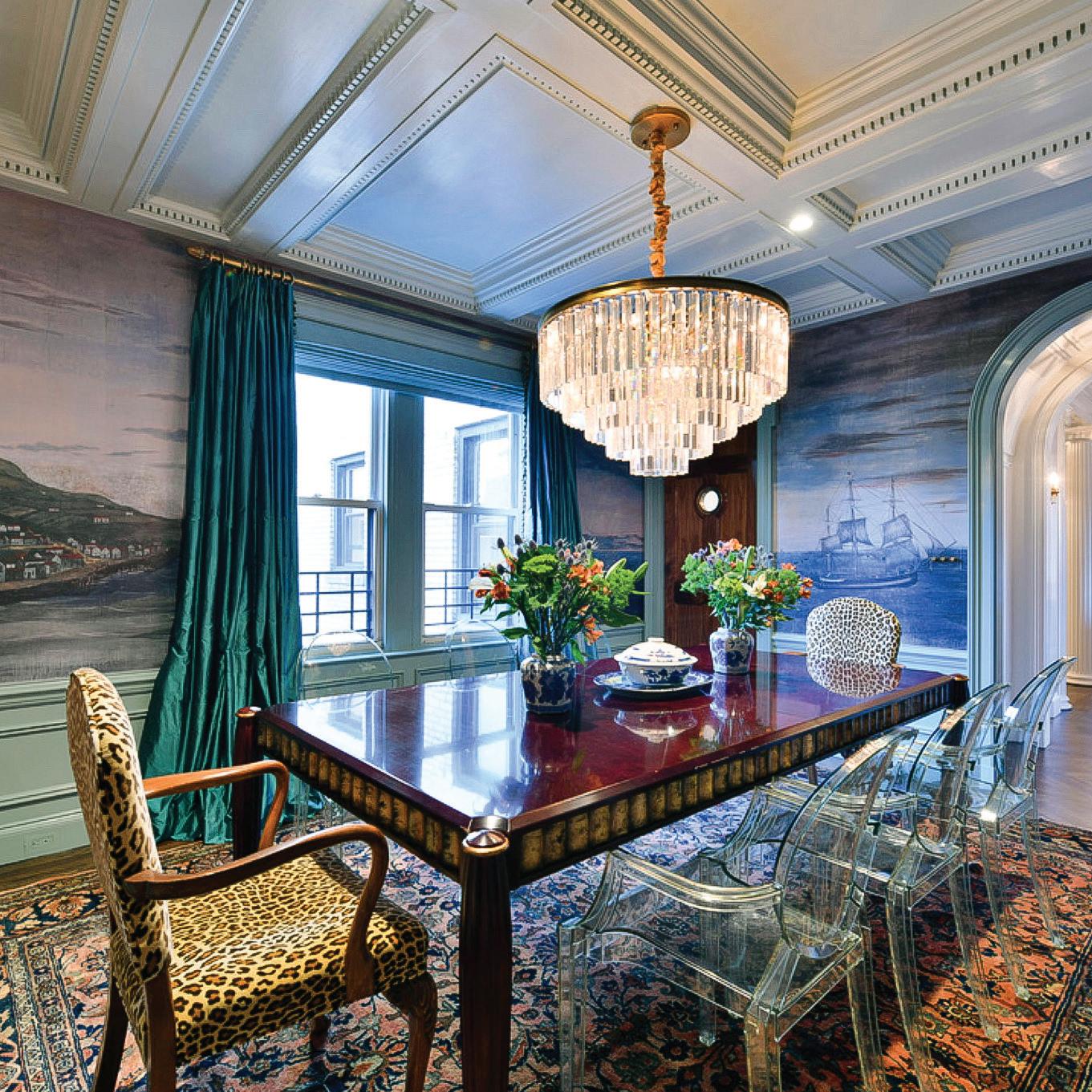 Deep blue paneled walls are lacquered to perfection in the handsome dining room.