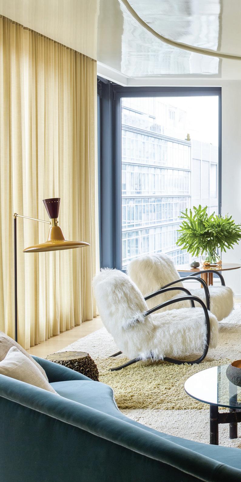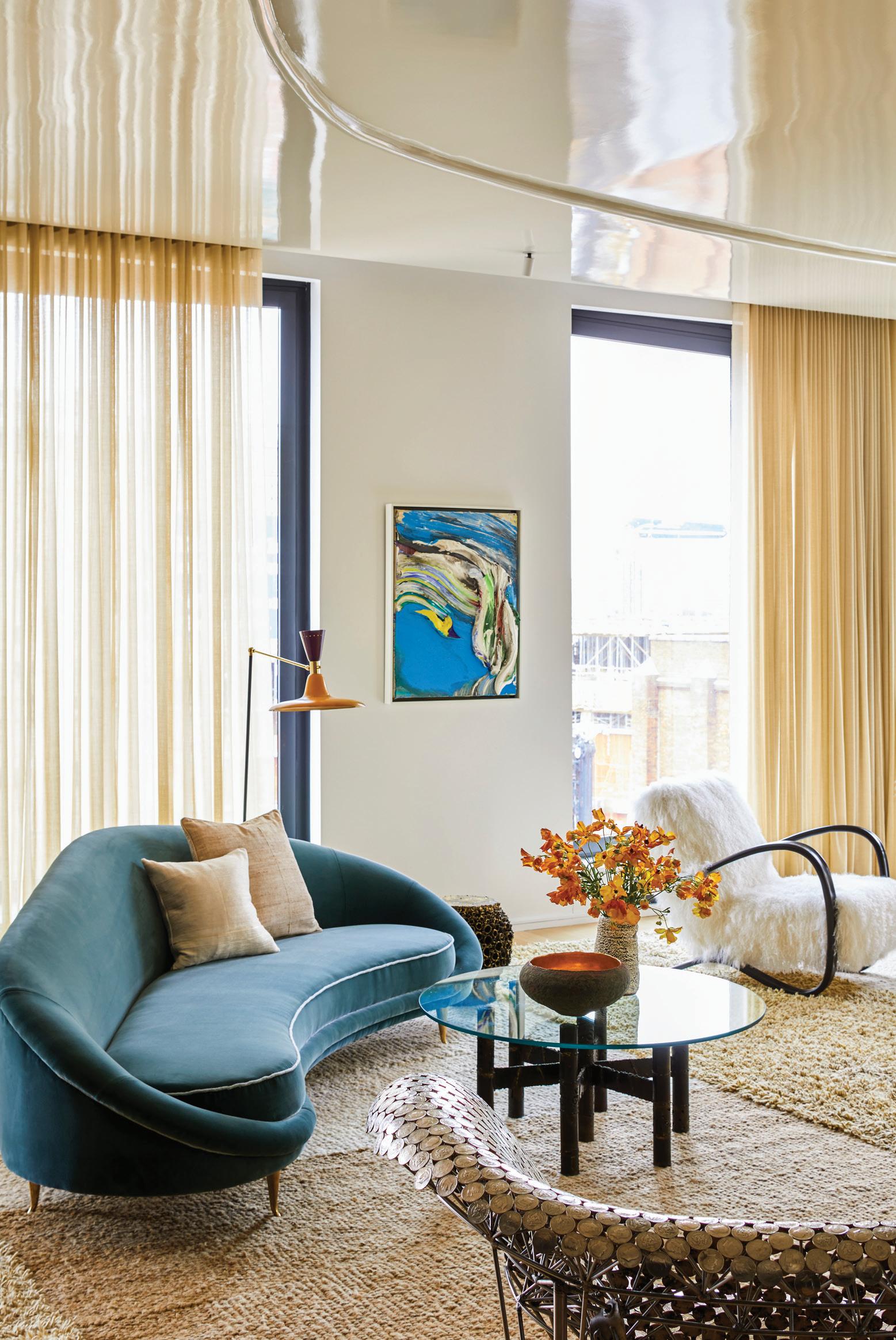 An ethereal lacquered ceiling reflects light and creates a warm glow throughout the living room.