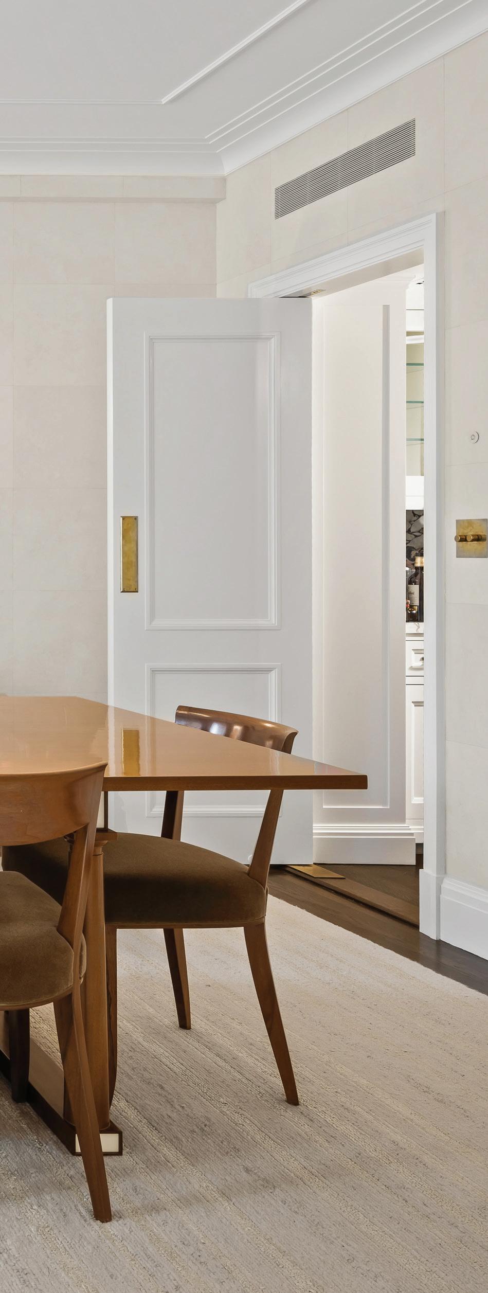 Intricate ceiling details, customcrafted doors, and meticulously restored moldings preserve the timeless historical aesthetic of a classic New York apartment.