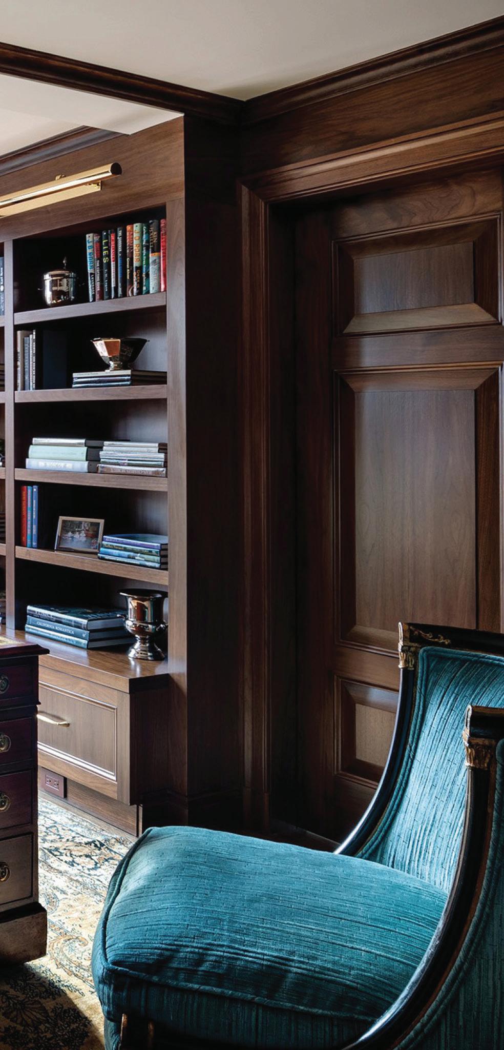 First page: The formal dining room was reimagined as a den, with lacquered walls and crown molding, built-in cabinetry, and spacesaving pocket door.