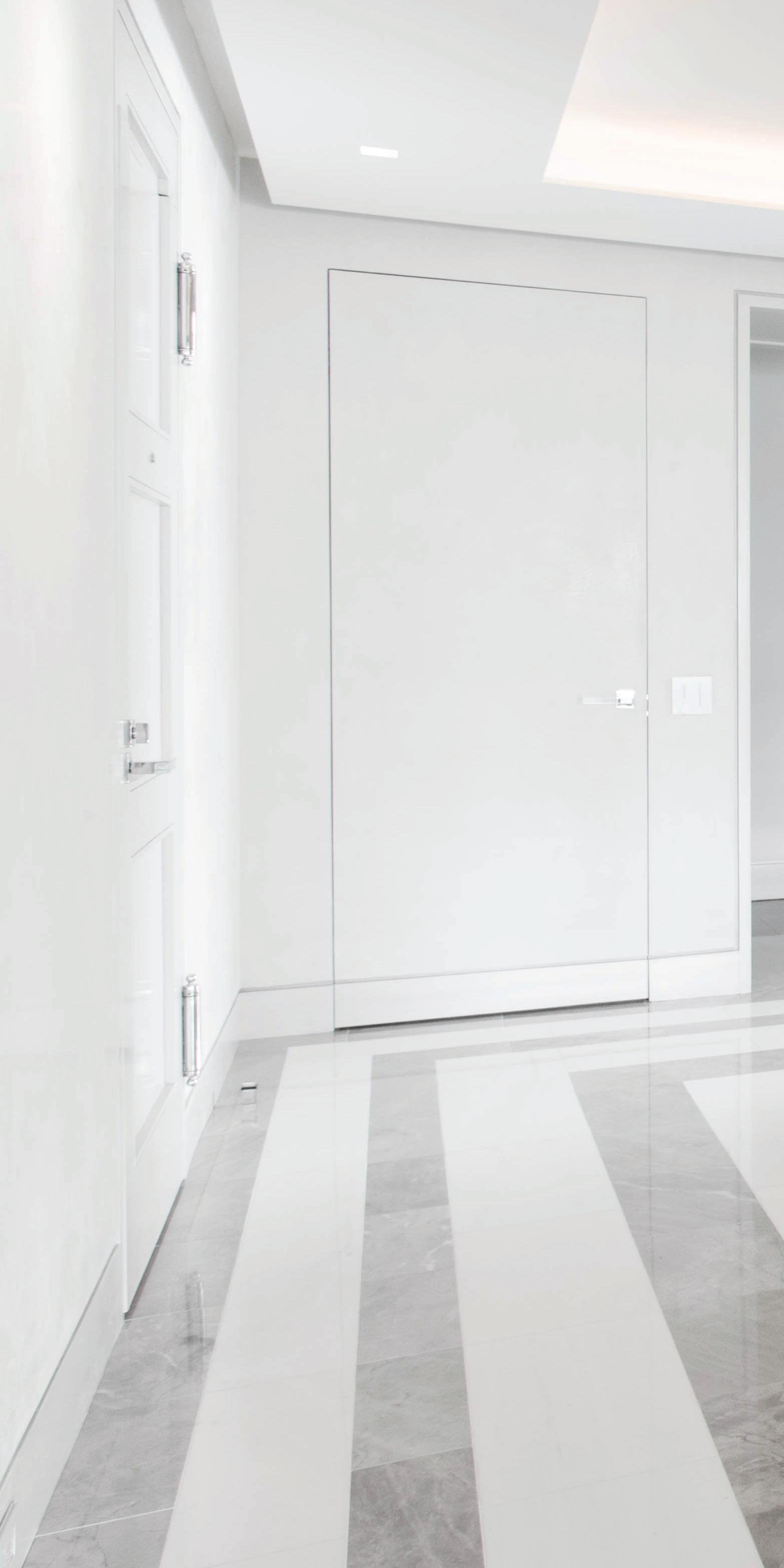The elegantly detailed vestibule separates entertaining areas from private quarters with three pair of seamless Harmon hinged doors. An intricate pattern of two types of marble has been expertly crafted on the vestibule flooring.