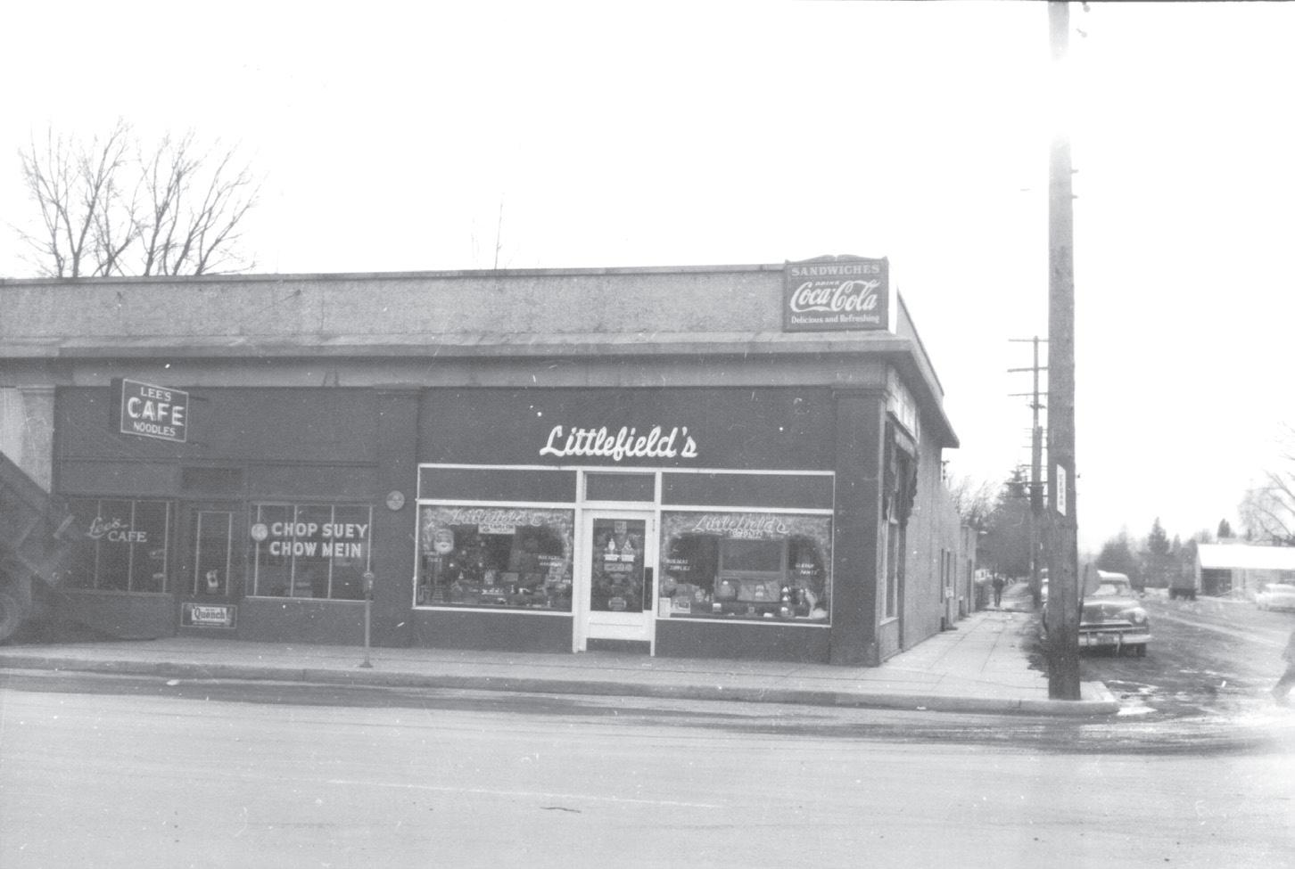 Littlefield’s on the corner of Cedar St. and Third Ave. in Sandpoint. To the left of Littlefield’s is Lee’s Cafe, a chop suey joint.