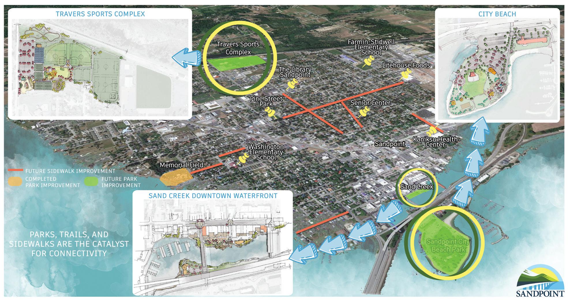 The site plan concepts for City Beach, the Downtown Waterfront and Travers/Centennial/Great Northern Sports Complex were developed as part of the Sandpoint Parks and Recreation Master Plan, which was adopted in 2020. The sidewalk projects are identified as critical connections to schools, parks, the library and senior center in the City’s Pedestrian Priority Network in the adopted 2021 Multimodal Transportation Plan.