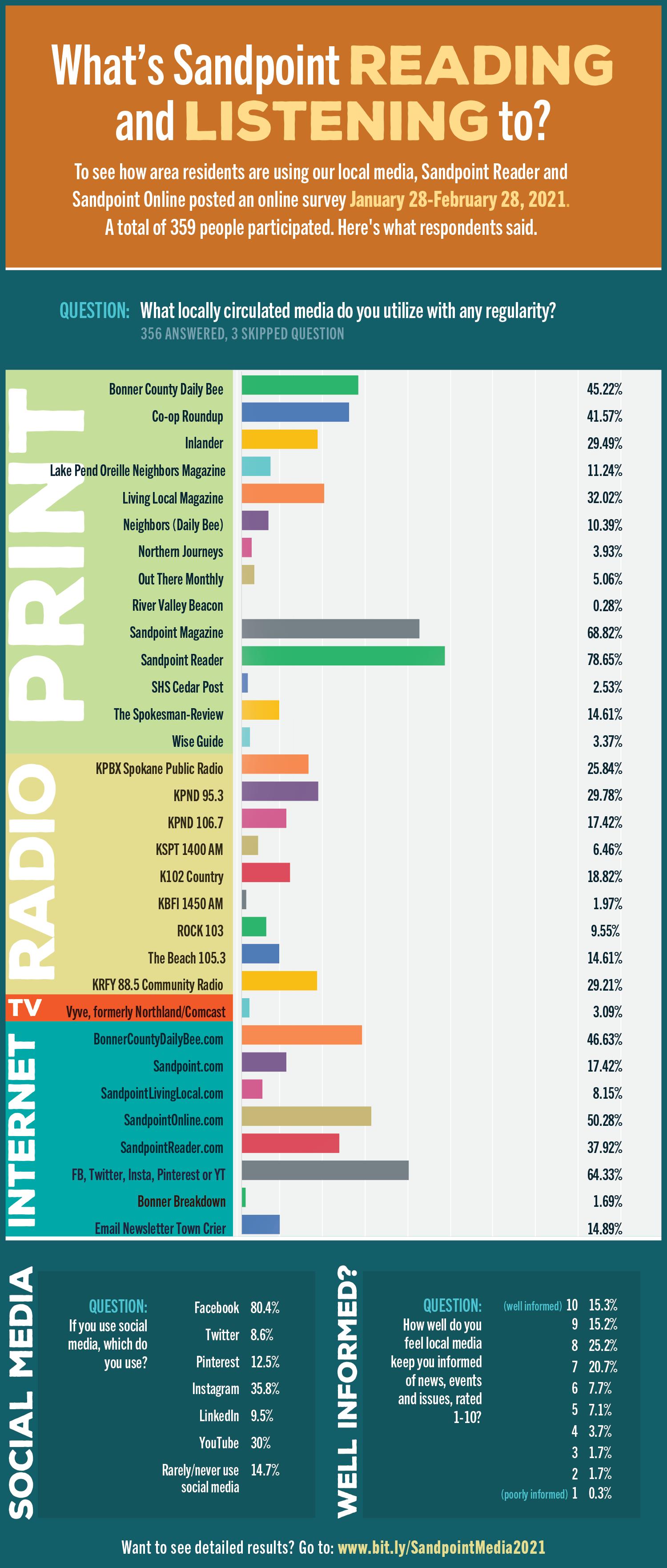 The Sandpoint Reader is a weekly publication owned and operated by Ben Olson and Keokee. It is devoted to the arts, entertainment, politics and lifestyle in and around Sandpoint, Idaho. We hope to provide a quality alternative by offering honest, in-depth reporting that reflects the intelligence and interests of our diverse and growing community. The Reader is printed on recycled paper using soy-based ink. Leftover copies are collected and recycled weekly, or burned in massive bonfires to appease the gods of journalism. Free to all, limit two copies per person