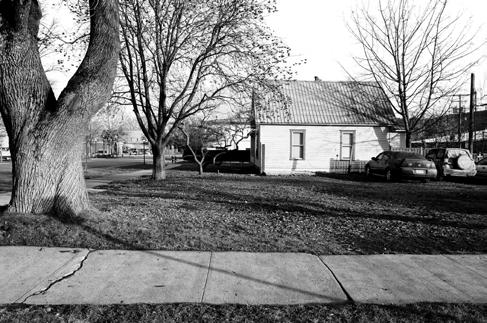 The same corner today. The site is now home to the food court across from Farmin Park, with lots of yummy options. The sidewalk has been replaced and bike rack added, but the old cottonwood on the left is still the same!