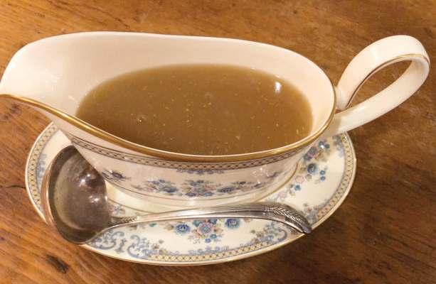 After reduction, you will end up with about 2- 3 cups of gravy. Adjust the seasoning and serve. To reheat, add a little of your leftover pan drippings to the gravy, whisk until it is thinned and heated through.