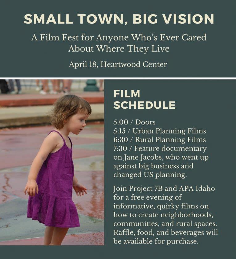 Project 7B and the Idaho Chapter of the American Planning Association hope to inspire the community with their new Small Town, Big Vision Film Festival on Thursday, April 18 at the Heartwood Center, by showing short and feature-length films that teach responsible land use and development.