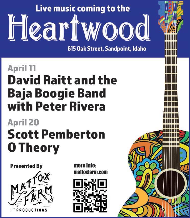 Wiebe Jammin‘, Pend d’Oreille Winery, April 13 Peter Rivera, David Raitt and Baja Boogie Band; Heartwood Center; April 11