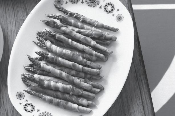 -Cut each slice of prosciutto in half and wrap one strip around each asparagus spear.