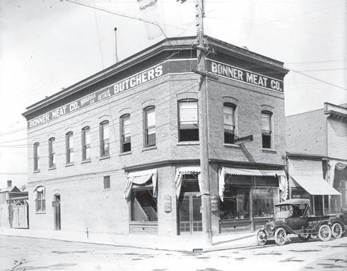 The Bonner Mean Company at First Ave. and Pine Street. The delivery truck parked at the corner is labeled “Bonner Meat Co.”