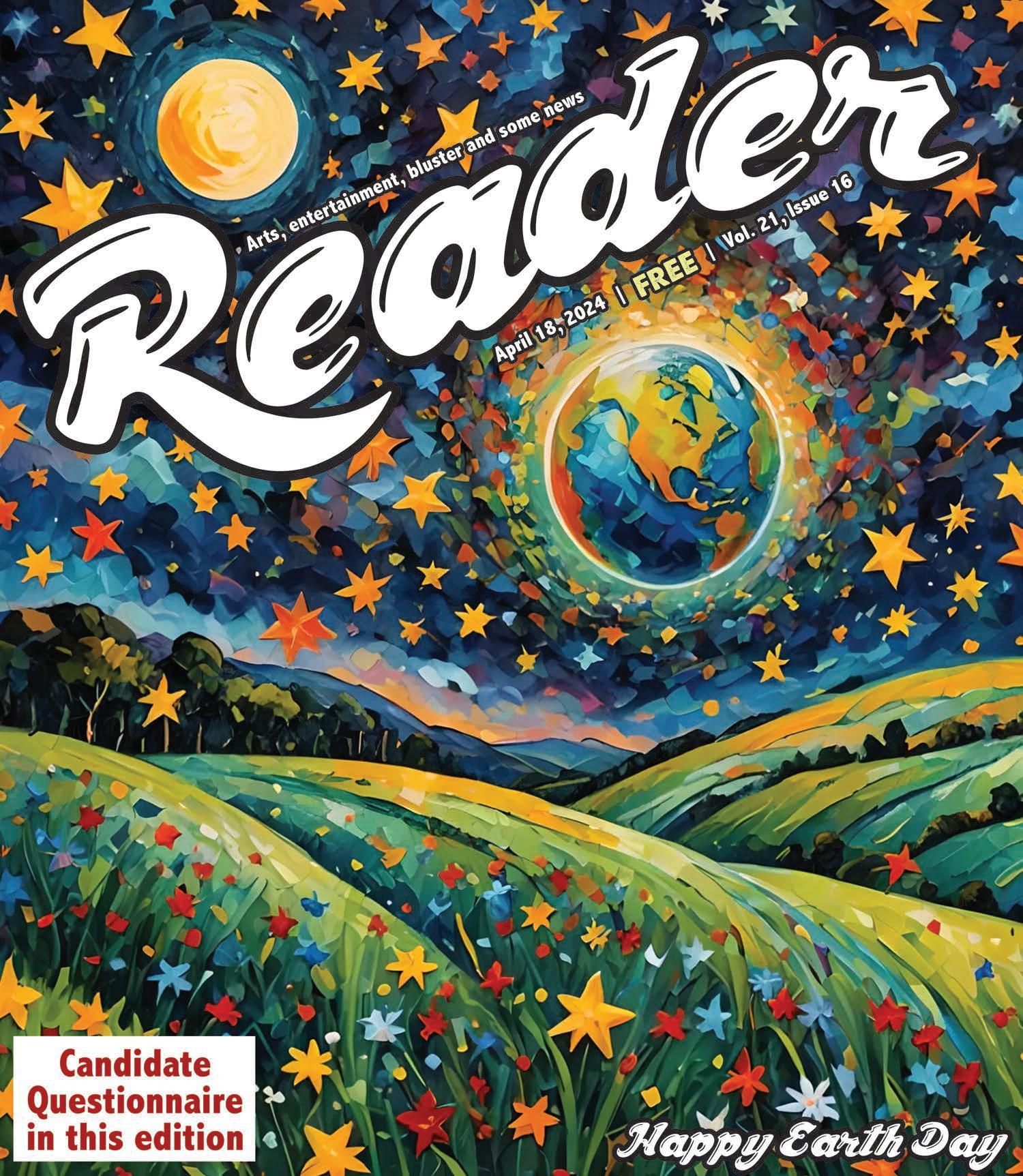 The Reader is printed on recycled paper using soy-based ink. Leftover copies are collected and recycled weekly, or burned in massive bonfires to appease the gods of journalism. Free to all, limit two copies per person