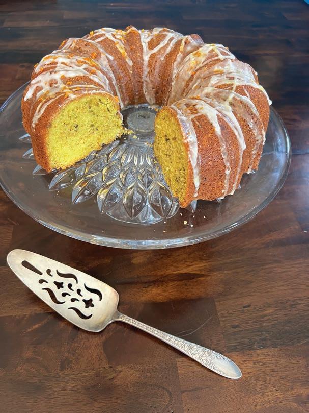 Pour batter into the bundt cake and bake for 45-50 minutes, or until a toothpick inserted in the middle comes out clean. Let the cake cool for 10 minutes in the pan, carefully turn out onto rack, then let it cool completely. Whisk powdered sugar and orange juice until smooth, pour over the cake. Sprinkle remaining zest.