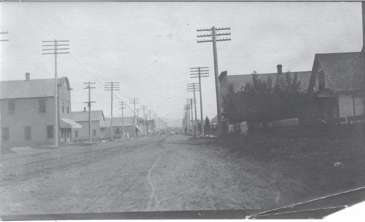 Looking south down Third Avenue from about Poplar Street. The building on the left is the Humbird Office (later the J.M. Brown Jr. Park). On the right side is the First Pennington Residence, and the Bottling Works, owned by Otto Greenhood and Bill Nieman worked there.