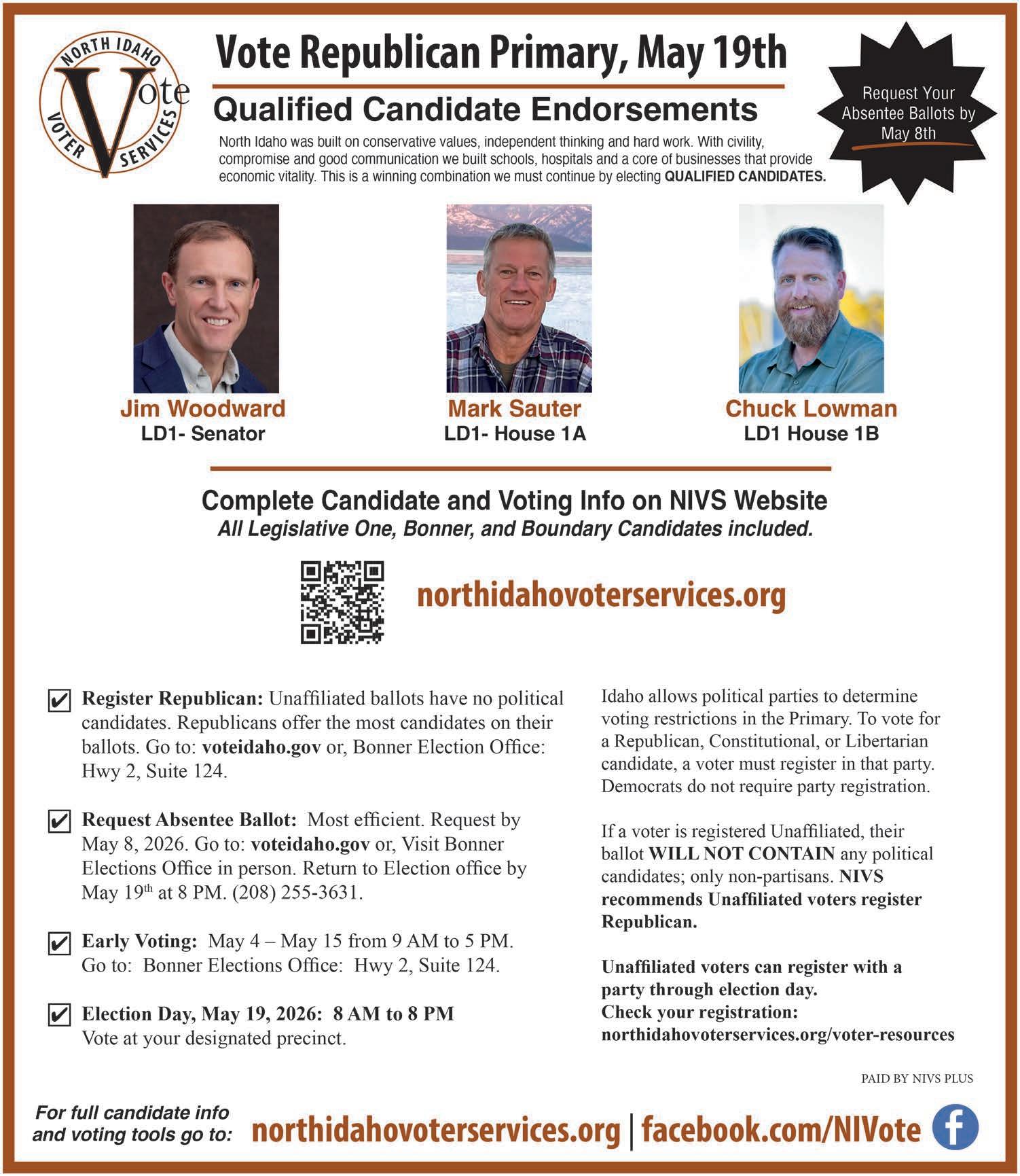 Look for completed questionnaires with candidates for contested Dist. 1 legislative and Bonner County positions published in the Thursday, April 30 edition of the Reader