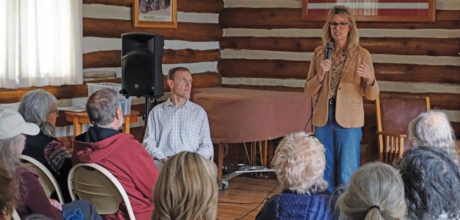 Debbie Critchfield speaks to constituents on March 28 while Jim Woodward looks on at the Sandpoint Comunity Hall.