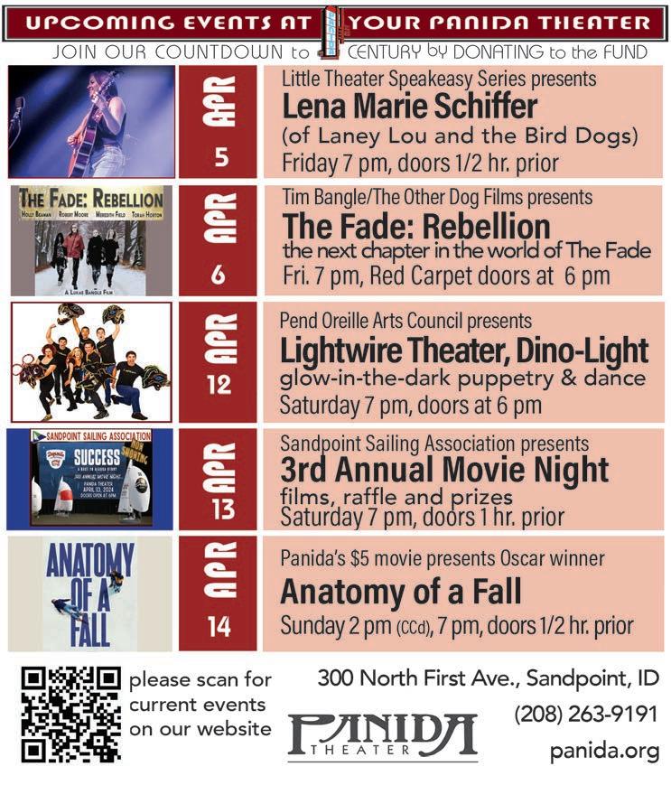 Finally, here’s another reminder about our upcoming candidates’ forum at Sandpoint High School audiotorium on Tuesday, April 30. We’ve invited candidates in District 1 Legislative races, as well as Bonner County, so please mark the date on your calendars. Ta ta for now.