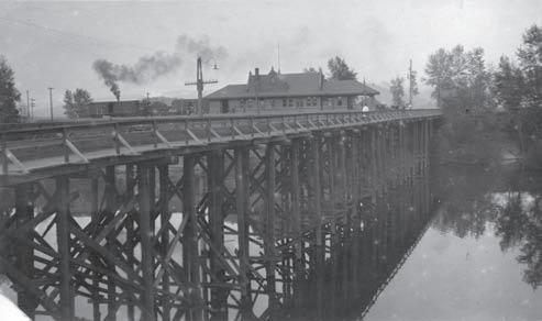 The Northern Pacific depot in Sandpoint, with Cedar Street Bridge in the foreground. You can see the smoke from a passing steam engine behind the boxcars to the left of the depot, and a person walking over the bridge.