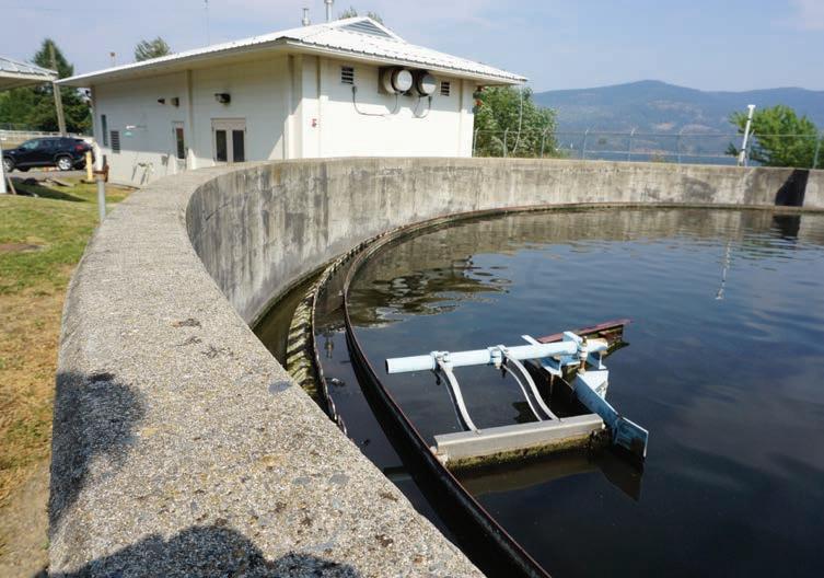 Left: Sandpoint Mayor Jeremy Grimm, center, meets with Plant Supervisor Devan Hull, left. Right: A clarifier tank at the wastewater treatment plant. Photos by Soncirey Mitchell.