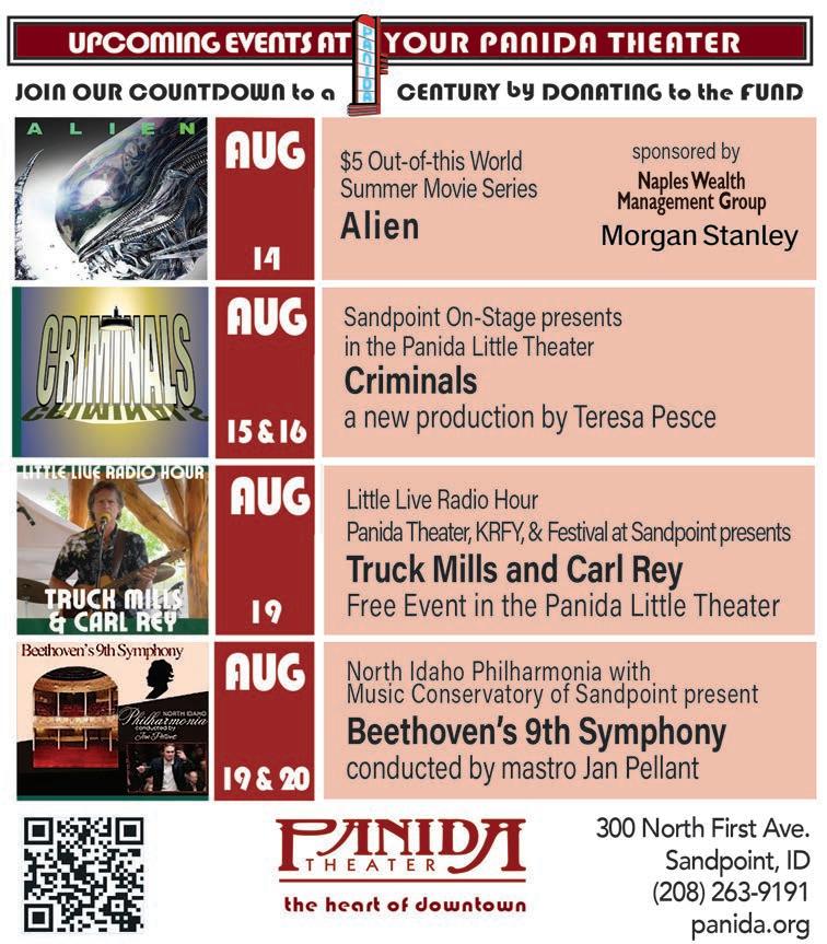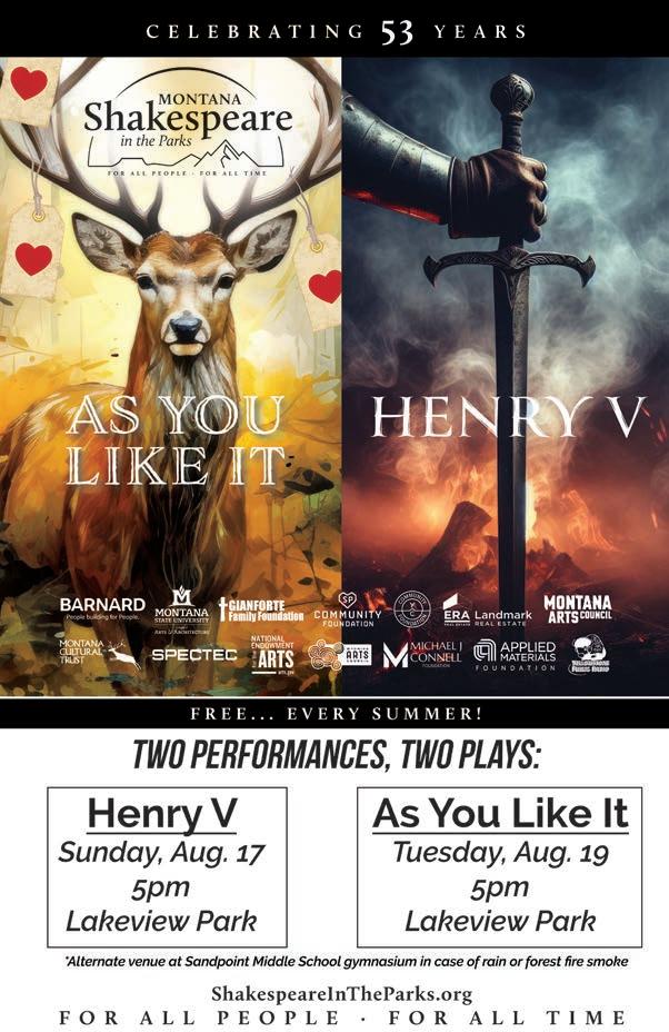 This year, instead of just one, we get two of the Bard’s plays with Henry V on Sunday, Aug. 17 and As You Like It on Tuesday, Aug. 19. The best part is it’s 100% free, though I always feel compelled to drop several bills in their tip jar afterward. The actors are always top notch, the set design is fantastic and the plays, of course, are always worthy. Read Page 19 for more information on these cultural high points in Sandpoint.