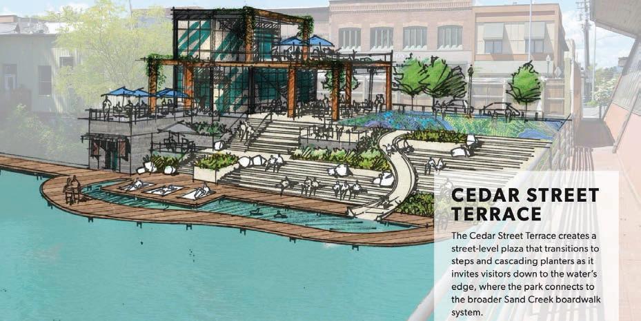 Mixed-use development is envisioned along the west bank of Sand Creek, though fronted with vegetative plantings to restore the riparian habitat. A terrace at Cedar Street would feature public space and plantings, along with the potential location for a small restaurant.