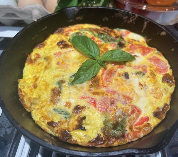 Frittata can be made and served in a seasoned cast iron pan. Salting the tomatoes will reduce the liquid and intensify the flavor. Serve anytime of day. Serves 4.