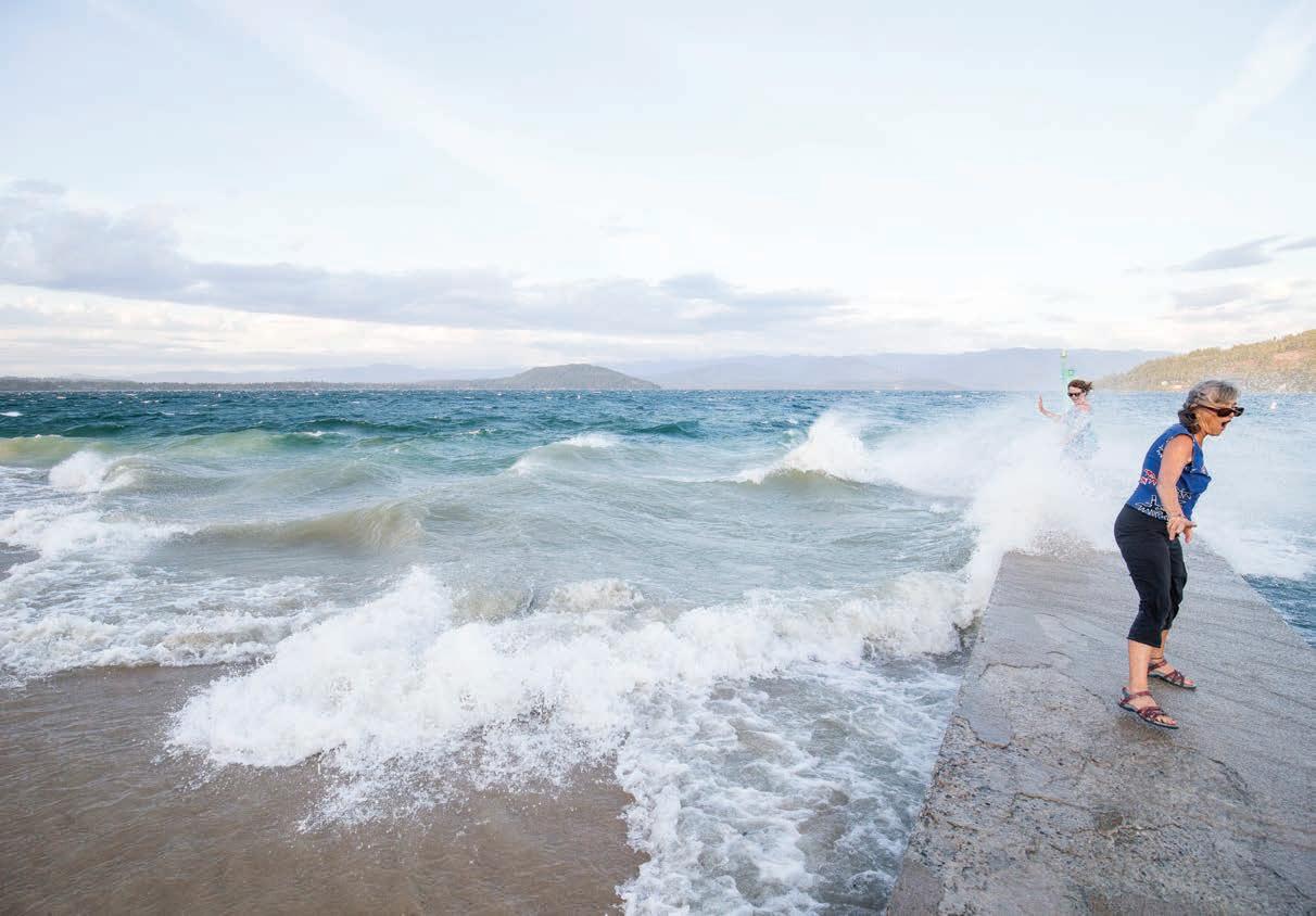 •Reilly and Rebecca Holland endure the waves at Sandpoint City Beach created by high winds last Thursday.