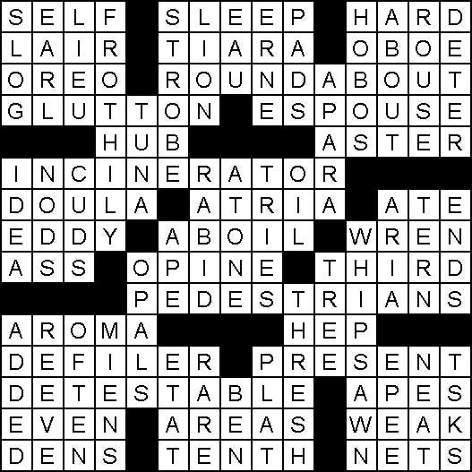 33. Courtyards 34. Consumed food 37. Countercurrent 38. Agitated 39. Small songbird 40. Donkey 41. Express a thought 42. Not first or second 43. Walkers 45. Smell