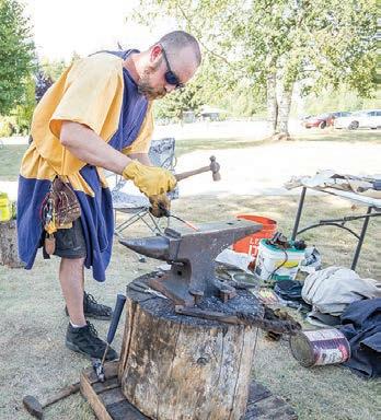 •Phillip Firestone (left), a member of the Sandpoint Blacksmiths Association and Aaron Miller demonstrate blacksmithing techniques before Montana Shakespeare in the Park’s performance of “Richard III.”